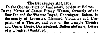 James Pitney Weston appears to have been a very colourful character. He was an entertainer and theatre manager, who came to Bolton in the early 1860s. The newspapers of the day contain a number of reports about him including, disputes about wages with performers at his theatres, licensing applications and breaches of the conditions thereof, accusations of plagiarism, and dealings with the law. One 1862 license application stated that "Mr. Weston was not unknown to some of the magistrates as a gentleman standing very high in his profession, and that he was proud to say with all sincerity that Mr. Weston had conducted the Bolton theatre with credit to himself and honour to the town". Other reports are less flattering.